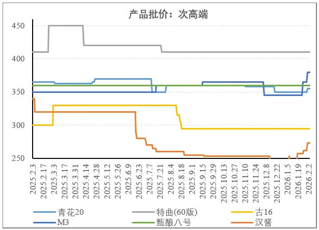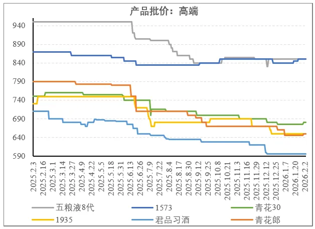 除了1573高度控价不要量之外,高端价格都有较大幅度下滑,相对而言,酱酒跌幅更大,相比去年同期,茅台1935、青花郎、君品习酒中跌幅最小的1935下跌14%,五粮液八代价跌10%,不过集中在禁酒令影响的25Q3,之后稳定在810(百荣批发市场)-840(今日酒价)。考虑到当前还有酒厂增加返利和费用投放的背景,高端压力可见一斑。