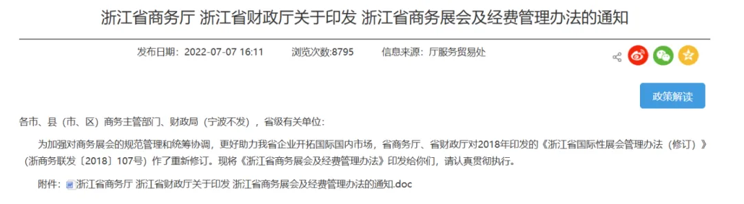 《浙江省商务展会及经费管理办法》(浙商务联发〔2022〕34 号),核心是规范商务展会管理、助力企业开拓国内外市场。办法明确商务展会按性质分为国际贸易展会和国内贸易展会,按重要性分为自办类、重点类、其他类,针对不同类型展会制定了涵盖场地租赁、展位搭建、宣传推广等多方面的分类补助标准(含线上线下不同档位),明确经费 “事前预拨、事后清算”、展会统计分析、目录动态调整等管理要求,同时建立监督检查和绩效评价机制,保障财政资金合规高效使用。