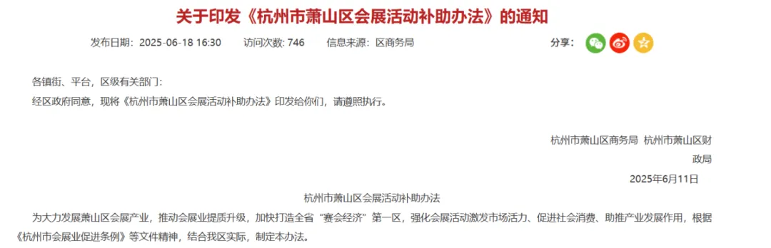 杭州市展会补贴以萧山区政策为核心,涵盖该区境内外会议与展览两类支持。