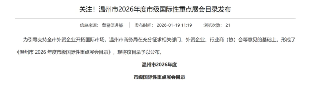 《温州市 2026 年度市级国际性重点展会目录》