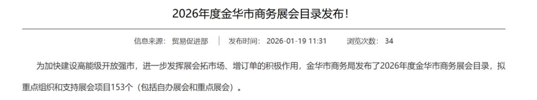 2026年拟重点组织和支持展会项目共153个,其中“金贸全球 金华优品海外行”系列自办展会12个,支持重点展会141个。