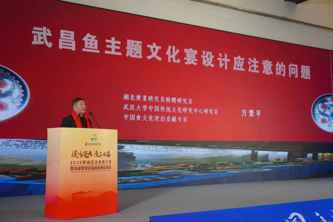 在嘉宾分享与建言环节,北京大学智能学院教授、湖北莲花山人工智能研究院院长马修军以《AI+文旅》为题,通过生动案例展示了人工智能在文化活化、体验创新等方面的无限可能,为鄂城文旅产业转型升级提供了新思路;中国烹饪大师、中国烹饪协会文旅特色美食委员会主席卢永良围绕武昌鱼的守正与创新,详解经典烹饪技艺与现代消费需求的融合路径;武汉大学中国传统文化研究中心教授方爱平聚焦武昌鱼主题文化宴设计,强调要注重服务与环境设计,打造沉浸式文化体验。