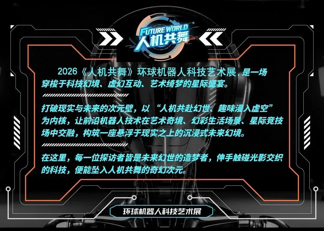 2026《人机共舞》环球机器人科技艺术展,是一场穿梭于科技幻境、虚幻互动、艺术绮梦的星际盛宴。