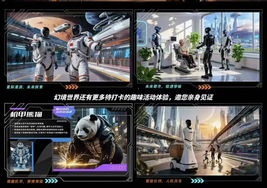 打破现实与未来的次元壁,以“人机共赴幻世、趣味漫入虚空”为内核,让前沿机器人技术在艺术奇境、幻彩生活场景、星际竞技场中交融,构筑一座悬浮于现实之上的沉浸式未来幻境。