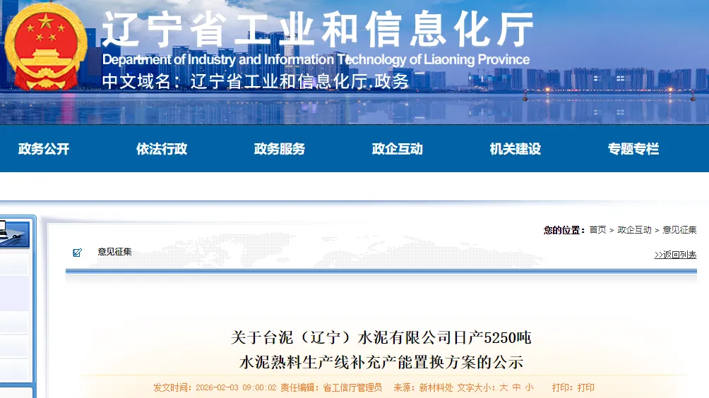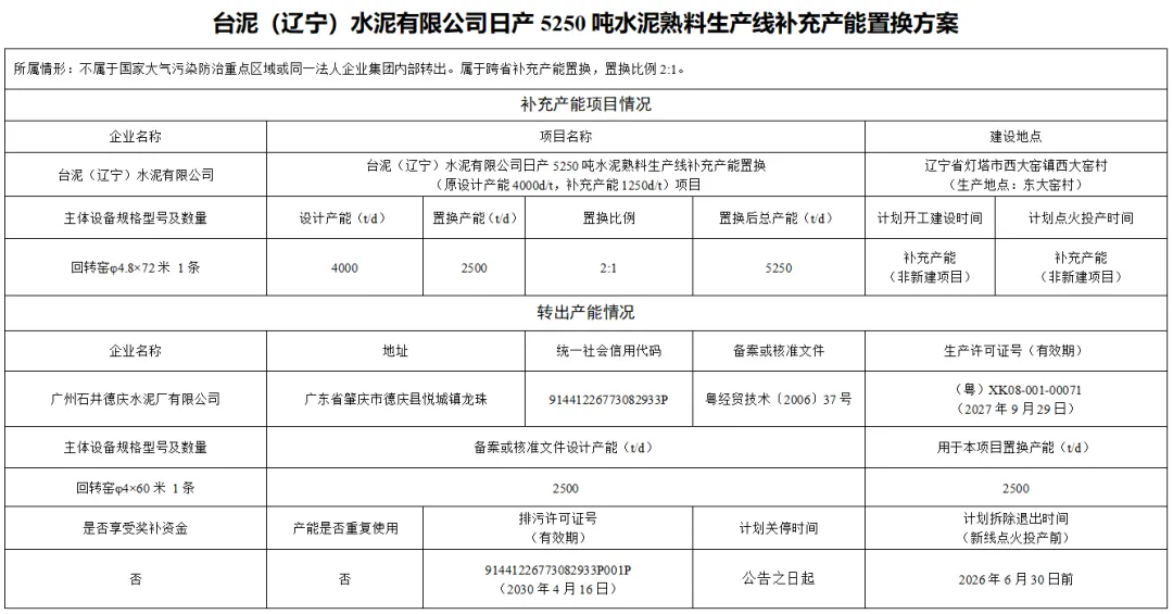 公示显示,台泥(辽宁)水泥有限公司日产5250吨水泥熟料生产线原设计产能4000t/d,置换产能2500t/d,调整后产能补齐至5250t/d,置换比例为2:1。