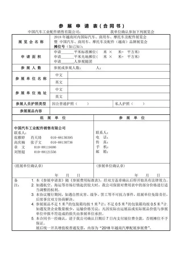 由于展会规模大,参展企业众多。我司本着先报名先分配摊位的原则,建议参展企业在确认参展后立即填写参展申请表(附件一)并传真至中国汽车工业配件销售有限公司。