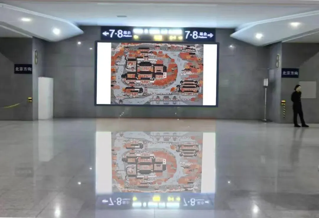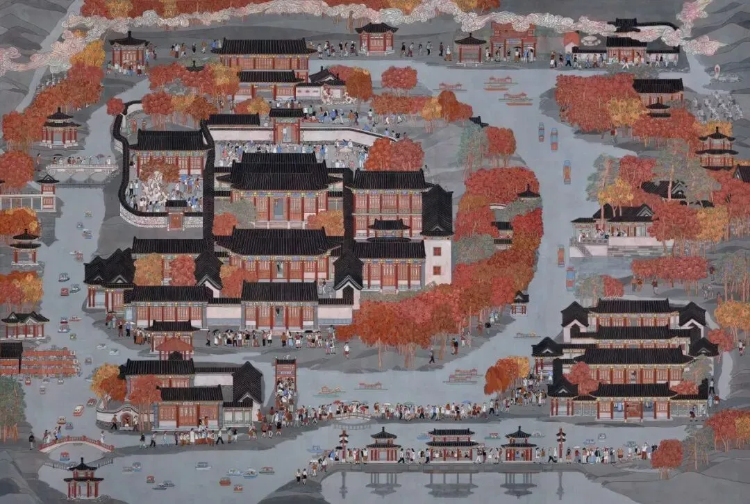 作品以世界最大的皇家园林——“避暑山庄”湖区景观、游玩休闲人流为主要描绘场景,通过其尊贵、恢宏、端庄、包容的清代康乾时期的盛世之景,配以现代多彩的游船和洋溢着幸福的游人,展现当今祖国盛世一派水天云在、水祥云瑞的美好景象。作品以红色为主色调,借古喻今展现我们祖国繁荣昌盛美好景象。作品悬挂于高铁站站台通廊墙壁,让观者享受到古代精美建筑、园林景观的艺术之美,弘扬厚重的历史文化,增强人民的自豪感;同时展现了人民群众在党领导下过上了富足的生活,有助增强人民群众爱党、爱祖国的伟大情怀。