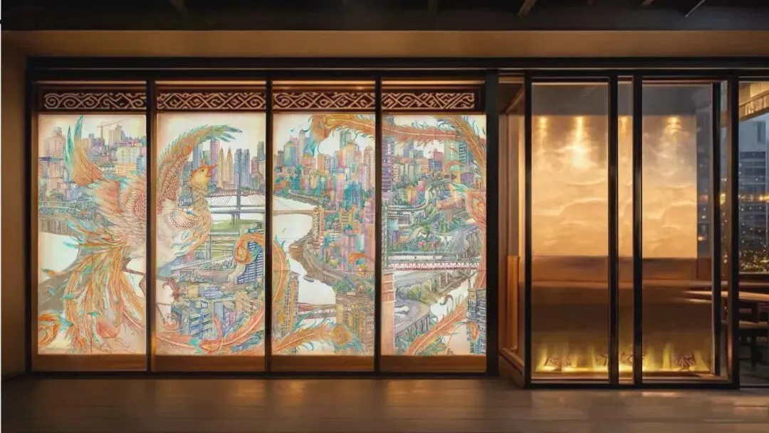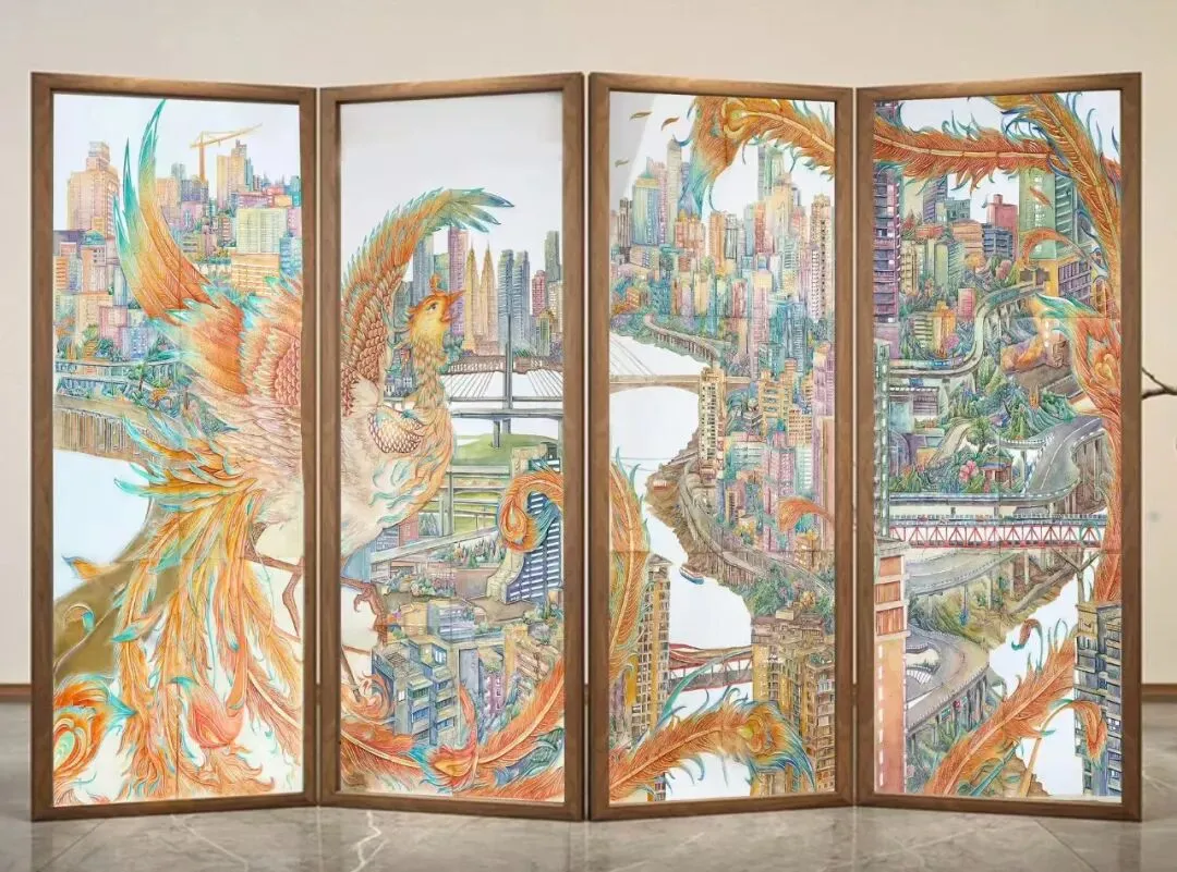 作品以重庆这座英雄般的城市为题,描绘了一只浴火重生的凤凰展翅高飞于重庆高低错落的建筑之上,意为这座城市历经磨难后的重生与崛起,勾勒出这座在抗争中也巍然屹立的城市与其新时代万象更新的兴起历程,来展现其不屈不挠的顽强精神与勇敢奋斗的坚强意志,唤起观者对重庆城市精神与民族精神的共鸣,激发对历史的敬畏,传承爱国精神与民族节气,达到以美育情的作用。