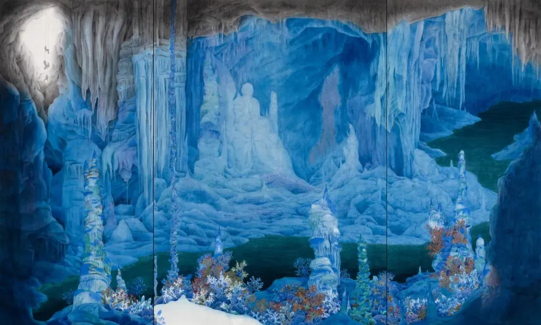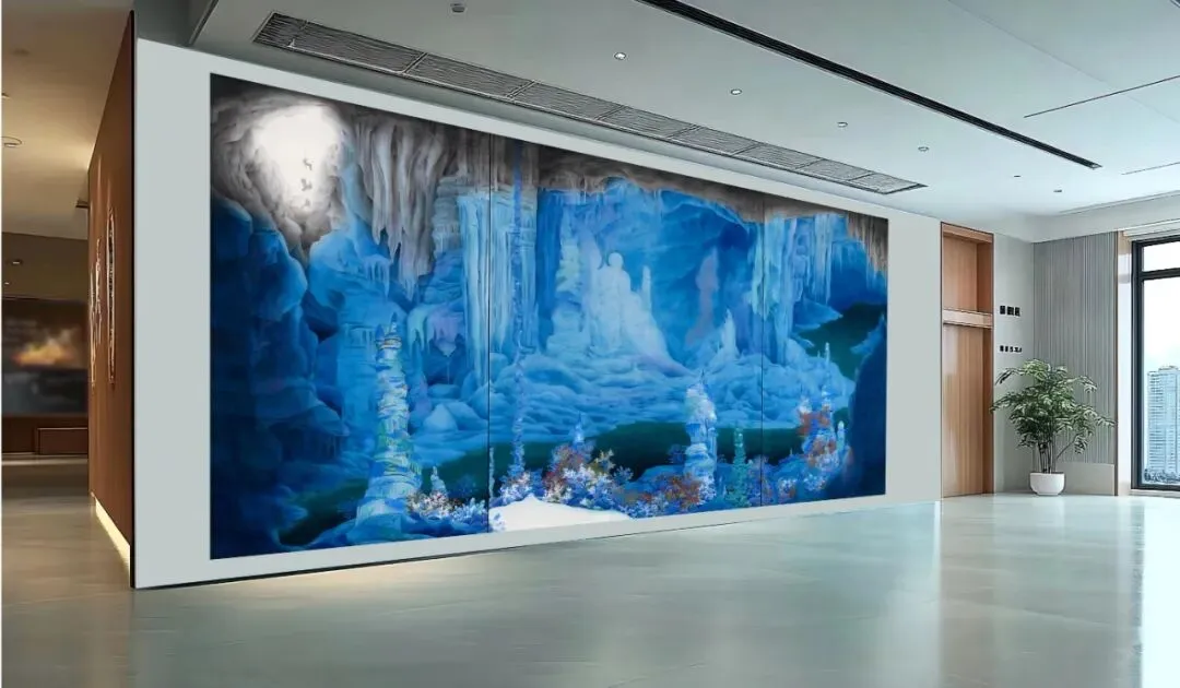 本作品为大型溶洞探索主题壁画,运用艺术手法层叠塑造怪石嶙峋的肌理,再现奇珍异宝的璀璨。画面引导观者视线深入洞窟,开启一段神奇的视觉探险。本作品力求以艺术手法强化形式美与色彩美,激发公众对自然造物与艺术创造的惊叹与联想。作品本身即是一次“发现”,鼓励人们以审美眼光探索自然,培养主动观察、发现身边之美的习惯与能力。