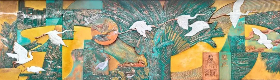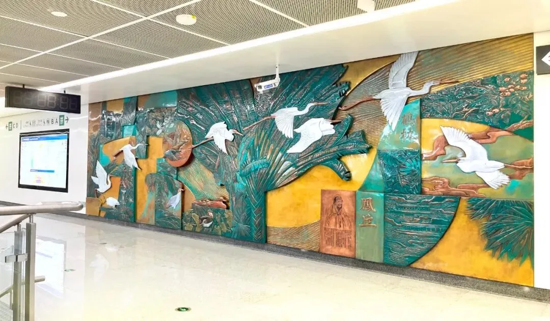 福州地铁横屿站附近北有牛岗山南有晋安湖,自然环境优美,人文遗产为朱熹创立紫阳书院之时在牛岗山题壁“鹤林”、“凤丘”。本作品以自然生态为主,用一水贯穿画面,串联北山南湖,画面中用本地植物表现自然生态风貌,白鹭飞鹤飞翔其中,呼应朱熹题字。画面表现自然生态的美好,亦隐喻此处人杰地灵。在地铁环境中营造自然恬淡、绿色人文的氛围,采用传统錾铜工艺,创新使用氧化铜色彩进行着色,丰富了材料质感,使传统工艺呈现出新的面貌。安装后经福州电视台等媒体报导,使壁画艺术得到更多观众的关注与喜爱。