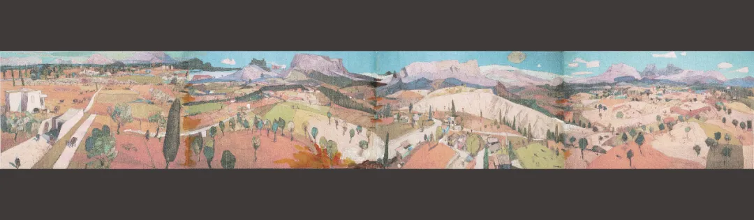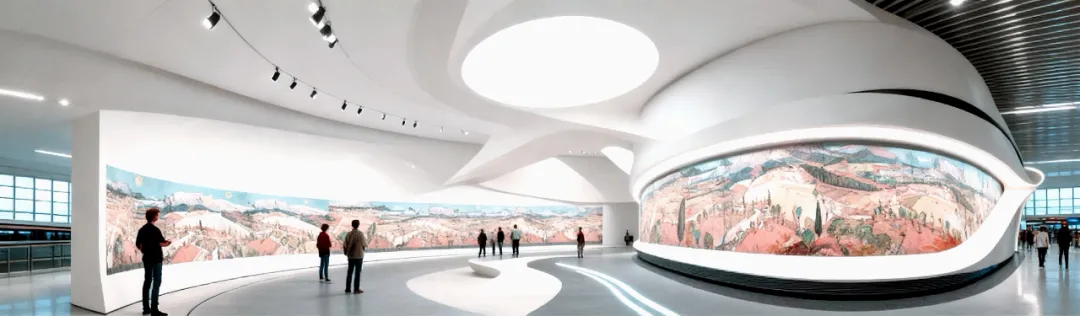 《圣维克多阡陌诗行》设计理念为融合东方水墨写意与西方风景结构,以叠色显域外地貌质感,借长卷式全景重构西域山地现代视觉。若于西雅图-塔科马国际机场廊道展出,可通过多元色彩与开阔构图,让观者沉浸式感受跨文化艺术魅力,激发对异域地貌与艺术融合的审美思考,提升公共空间的美育氛围与文化感知力。