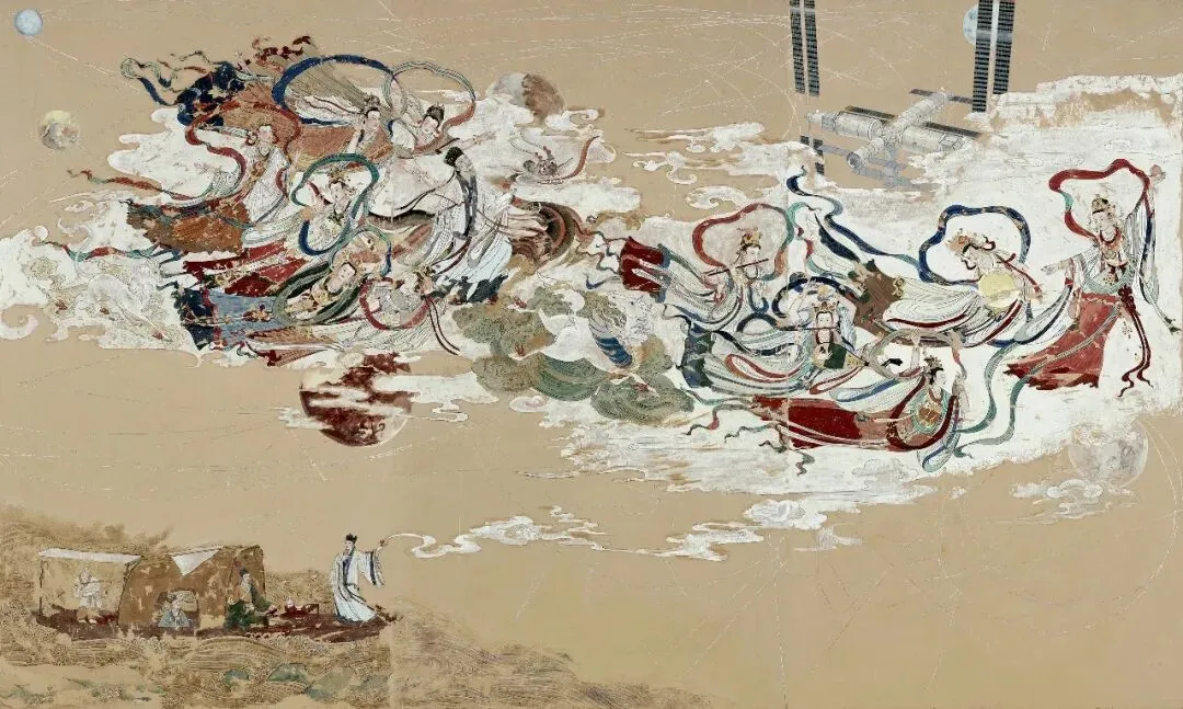 壁画《赤壁赋·寰宇今昔》以苏轼《赤壁赋》的意境为出发点,共绘制两层,在第一层画面中融入传统壁画中的飞天形象,表现苏轼“与飞仙明月同游”的精神想象。第二层叠加星象图、星球以及“天宫空间站”,象征当代人类真正走向了宇宙。作品通过传统与当代的并置,展示了人类从诗意幻想到科学飞行的连续性,也折射出对“有限生命与无限宇宙”的永恒思考。在公共环境中,该作品不仅以鲜明的视觉层次营造沉浸感,更通过跨越时空的叙事引发观众的思考与共鸣,让传统文化焕发新的生命力。它既能激发大众对历史文化的兴趣,也能唤起对科学探索与未来图景的想象,从而发挥美育启迪心智、涵养情感的积极作用。