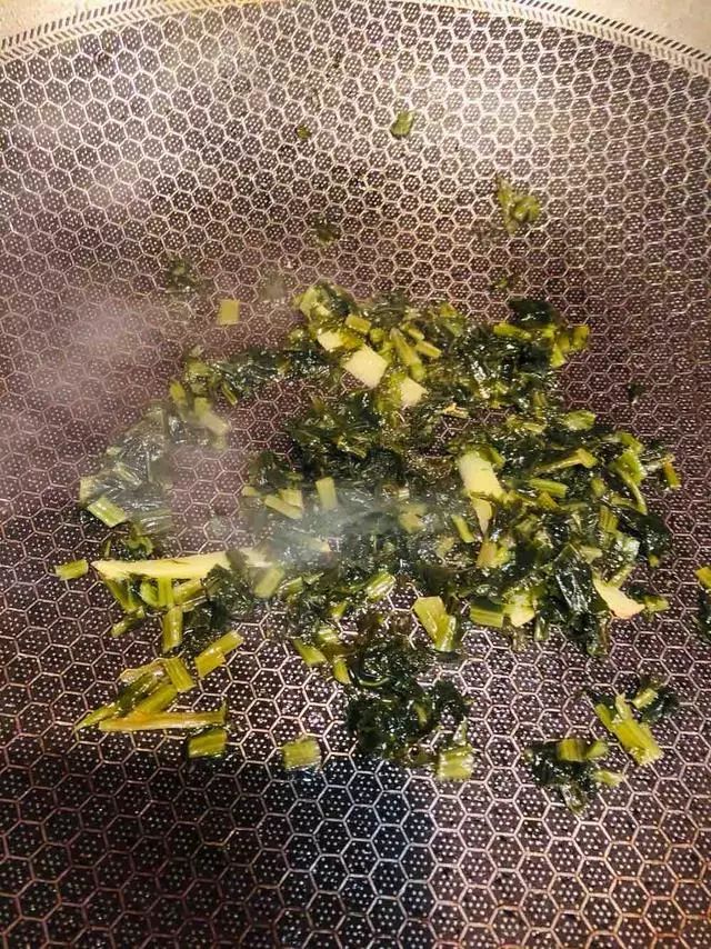 4. 热锅热油,爆香姜葱,放入雪菜末翻炒半分钟