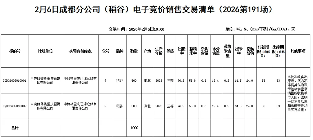 受中国储备粮管理集团有限公司成都分公司委托,重庆市粮油批发市场有限责任公司(即国家粮食重庆交易中心,以下简称“批发市场公司”)定于2026年2月6日10:00举办成都分公司(稻谷)电子竞价销售交易会,现将有关事项公告如下: