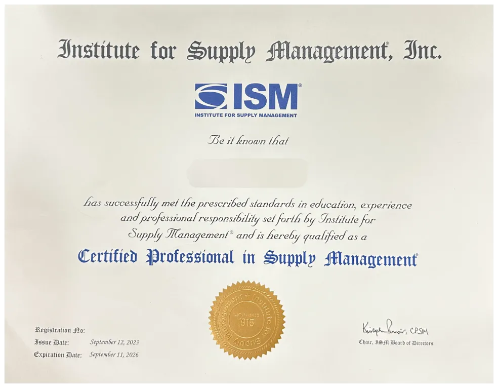 由国际供应管理协会(ISM)颁发,是全球采购供应链领域的黄金认证,代表行业顶尖专业水平。