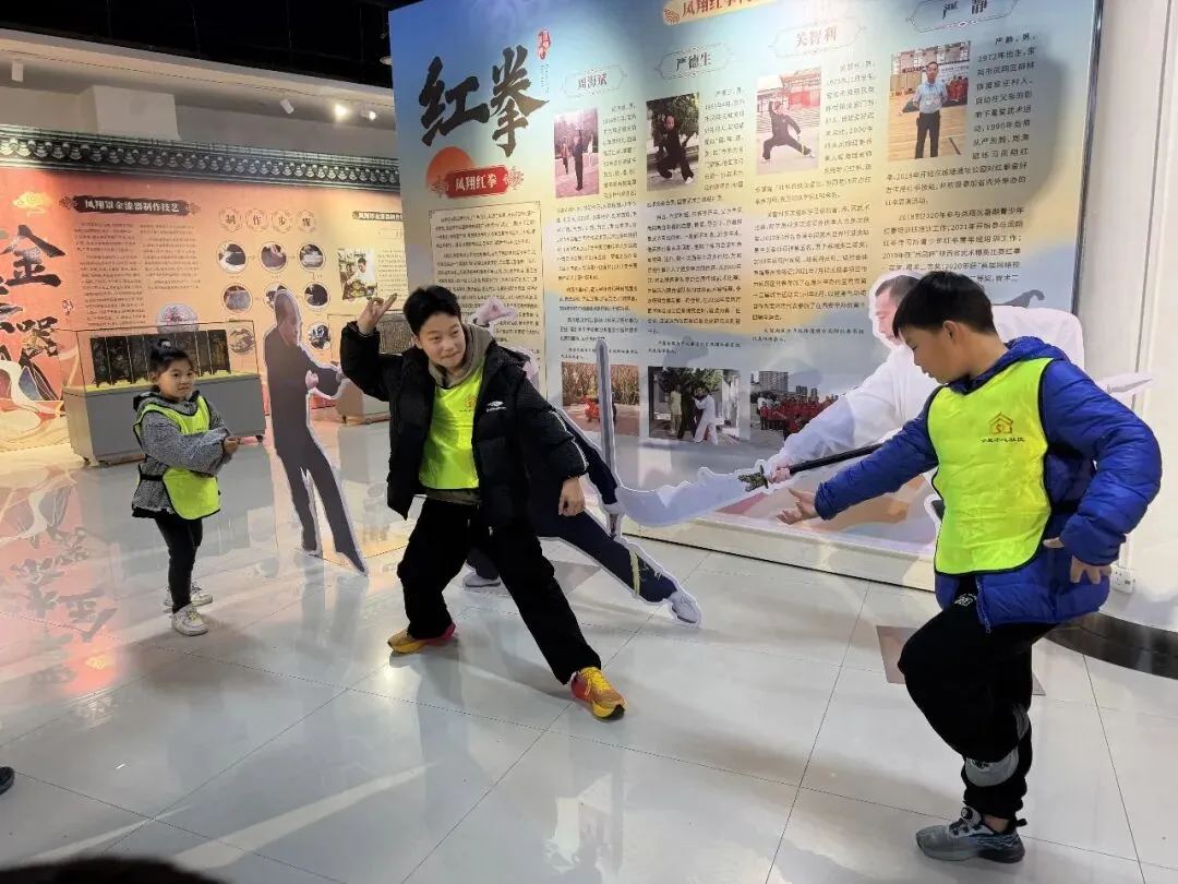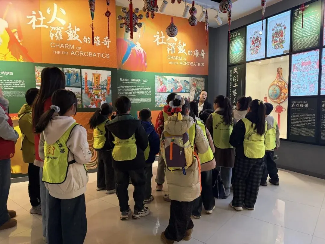 随后,孩子们来到非遗文化馆,一场充满烟火气与艺术感的非遗盛宴就此拉开帷幕。展厅内集中展示了宝鸡丰富的非物质文化遗产项目,其中既有宝鸡社火、凤翔木版年画、凤翔泥塑、西秦刺绣、炎帝祭典5个国家级非遗项目,也涵盖了社火脸谱、西府皮影、宝鸡剪纸、凤翔草编、面花礼馍、千阳八打棍等多个省市级非遗项目。