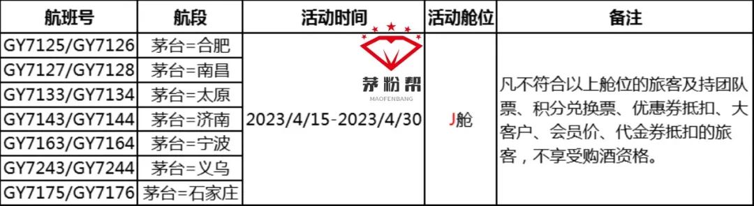 凡购买多彩贵州航空有限公司“茅台-合肥”、“茅台-太原”、“茅台-济南”、“茅台-宁波”、“茅台-义乌”、“茅台-石家庄”、“茅台-南昌”指定舱位的茅台机场进港航班旅客,在完成乘机后可通过茅台机场APP,参与以1499元/瓶的价格预约购买飞天53%vol 500ml贵州茅台酒(带杯)2瓶的活动。航班详情,请见活动列表。