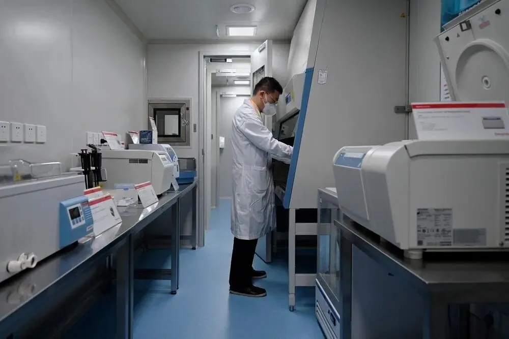 赛默飞移动方舱核酸检测实验室是严格依据核酸检测P2以上实验室标准设计、生产,具有生物安全保障的密闭检测系统。移动方舱将新风舱、更衣室、试剂准备间、样品处理间、扩增间等环节完美整合,通过一辆拖车即可快速调配,保障了核酸检测的灵活性与安全性。该实验室一天混检能达到2万份,最快2小时能出检验结果。