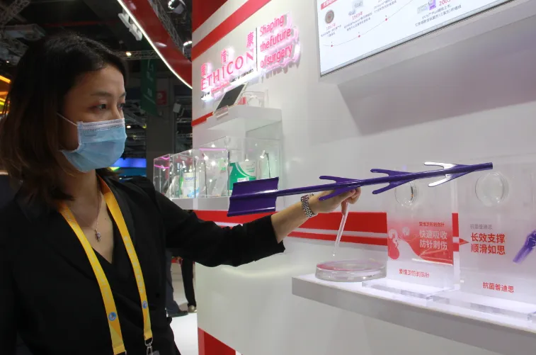 在放大模型中,可以看到,线的结构和材质都使用了鱼骨状的倒刺结构。这样的缝合线,不需要再打结。爱惜卫快薇乔由强生中国研发团队自主创新、为中国市场量身打造,也在进博会期间迎来全球首秀。爱惜卫快薇乔是为守护中国助产士而生的缝合产品,在快速吸收的快薇乔缝合线上搭载了爱惜卫防刺伤针,以降低助产师被针刺伤的风险。