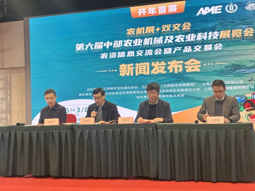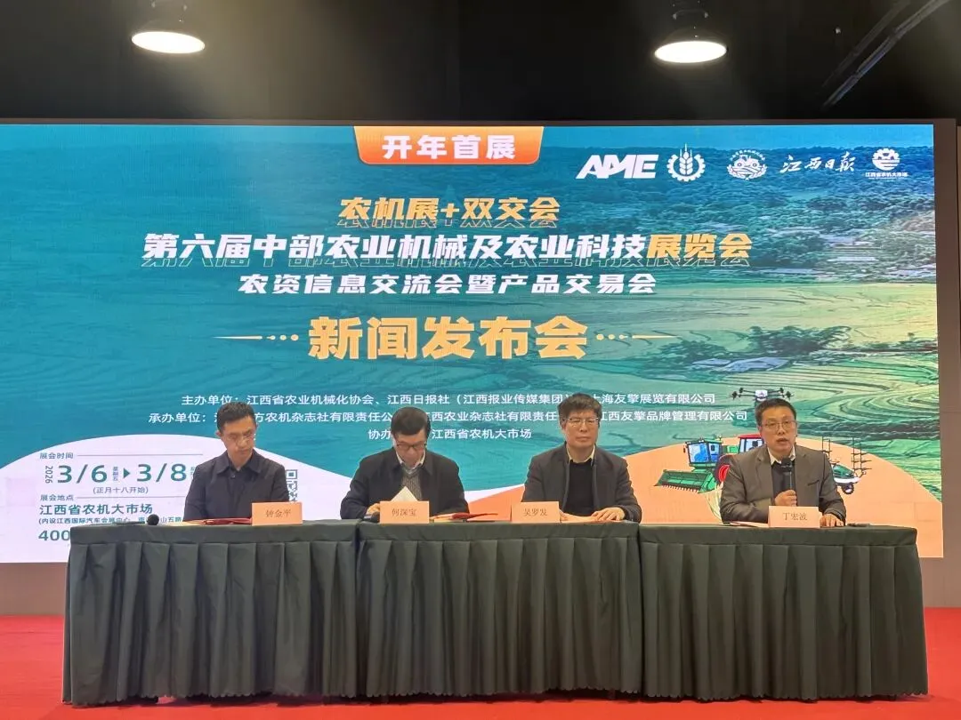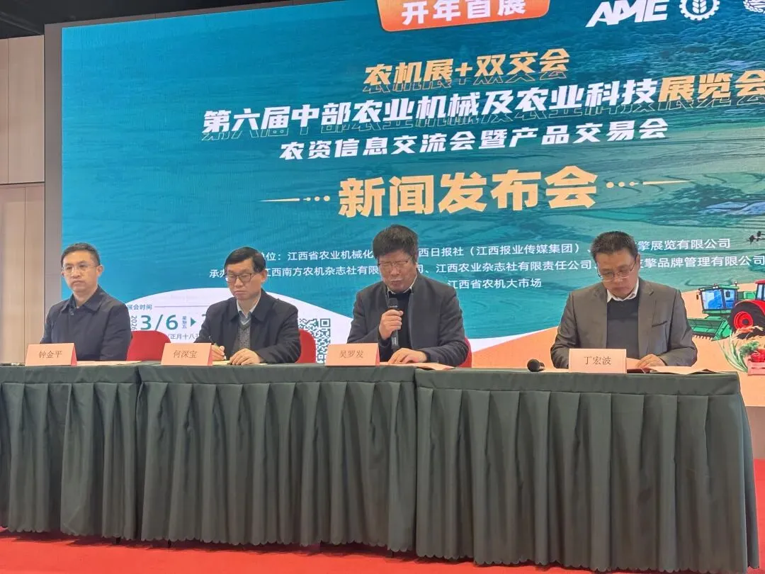 2026年2月4日,第六届中部农业机械及农业科技展览会新闻发布会在江西省农机大市场顺利召开。江西省农业机械化协会会长吴罗发、上海友擎展览有限公司董事长丁宏波、江西报业集团总经理办公室副主任何深宝等主办单位代表出席发布会,部分农机企业代表以及媒体记者共同参会。会议由江西江报农业科技有限公司总经理钟金平主持。