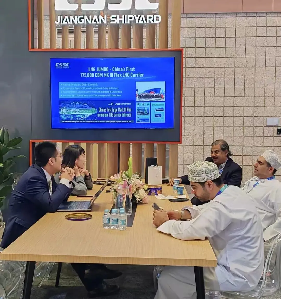江南造船极具专业度的展台共计接待全球专业访客超过600人次,有国际能源公司壳牌、美孚、卡塔尔能源、道达尔能源、康菲、Eni、马国油、切尼尔、Woodside、Uniper、阿曼LNG、康菲、Venture Global等,还有MOL、NYK、Kline、IINO、中远海能源、山东海洋能源、招商气运、MISC、Asyad等国内外知名船东,CCS、DNV、LR、ABS、BV以及薄膜型专利技术公司GTT等。来宾对江南展示的各类船型和自主B型舱技术方案表现出浓厚兴趣,开展了商务与技术交流。同行业的韩国现代重工、三星重工、韩华海洋也在江南典型主建船型旁驻足观看,并和江南团队交流讨论。