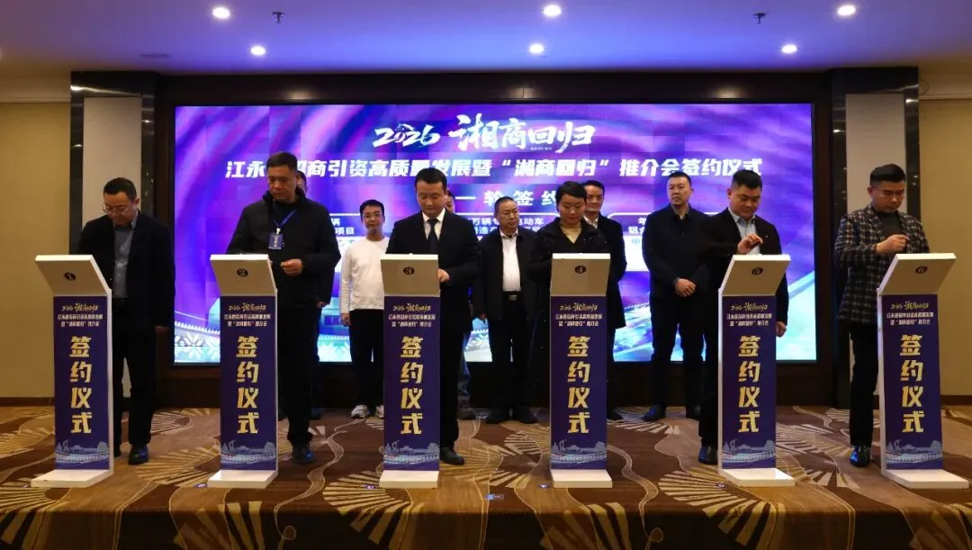 2月4日,江永县招商引资高质量发展暨“湘商回归”推介会召开。县委书记李群辉出席会议并致辞,县委副书记、县长于思洋,县领导李林、杨敏、钱建洪、彭浩宸等出席;江永县企业代表、新签约企业代表、在谈企业代表、江永籍异地企业家代表、商协会代表、招商大使等百余人齐聚一堂,共商合作、共话发展。会前,全体参会代表实地参观了永州市中新再生资源有限公司、江永县青鹤铝业有限公司、永州市中新铝业有限公司及永州戴瑶食品科技有限公司,代表们与企业负责人深入交流,详细了解江永县循环经济产业集群培育成效及特色农副产品加工产业发展现状,对江永的产业基础与发展潜力给予了高度认可。推介会上,县委书记李群辉致辞。他指出,江永县生态环境优美、农业资源富集、产业势头良好,是一个潜力无限、大有可为的投资胜地。近年来,江永县抢抓湘南湘西承接产业转移示范区等机遇,集中力量建强建优了一批产业链条,全县“一主一特”产业持续壮大,累计培育循环经济产业链关联企业54家、农副产品加工企业25家,实现了企业与地方经济双向共赢。他表示,希望以此次推介会为契机,诚挚欢迎各界企业家朋友走进江永、选择江永、投资江永、兴业江永,成为江永高质量发展的合伙人。全县各级各部门将一如既往为企业提供全方位、全周期的优质服务,全力营造一流营商环境,与大家携手共创合作共赢、繁荣发展的新未来。会上,县委副书记、县长于思洋围绕江永产业发展现状、未来招商方向、产业发展优势三方面作了招商引资推介;江永县企业代表、新签约企业代表及行业协会专家代表先后发言,分享合作愿景,表达发展信心;现场还为2名企业家颁发了江永县招商大使聘书。现场集中签约了9个项目,总投资达18.79亿元,涵盖电动车、新材料、废旧电池回收拆解及资源化利用等多个领域。这些项目的落地实施,必将为江永的“一主一特”产业发展注入强劲动能。