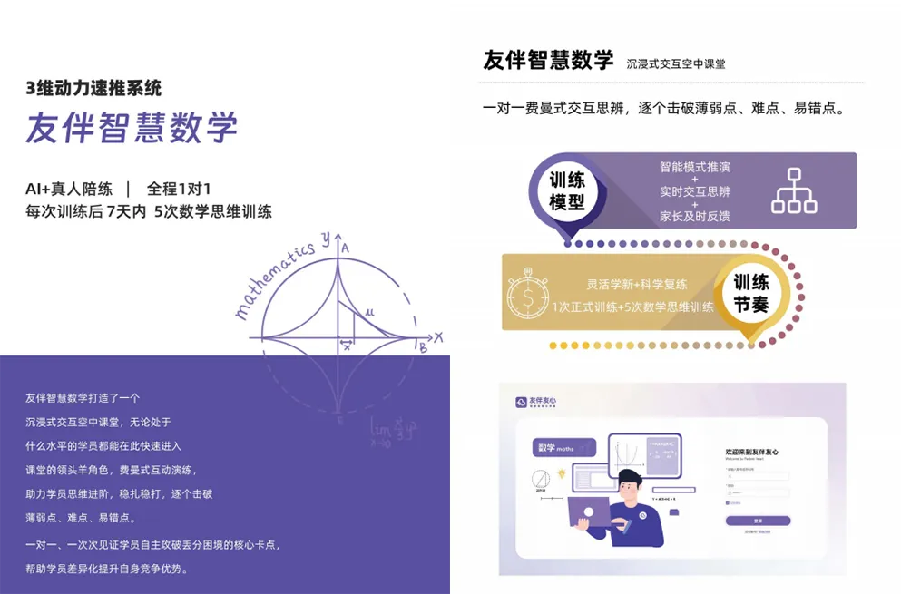 友伴友心团队携手中国科学院的心理学专家、北京外国语学院的语言学家以及北京师范大学的教育专家,共同研发出了一套前沿的智教训练系统,旗下友伴智慧数学、友伴智慧英语、友伴智慧物理为平台受好评的明星产品。
