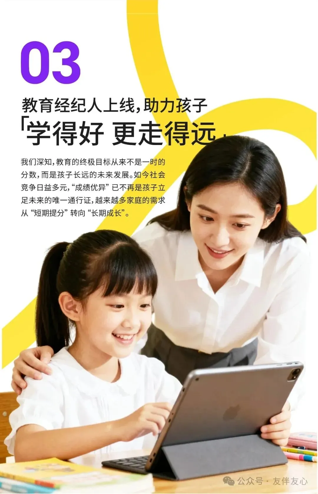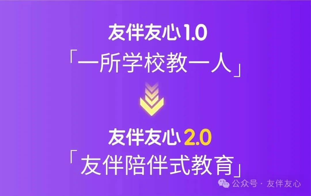 从 1.0 时代 “一所学校教一人” 的理念落地,到 2.0 时代 “友伴陪伴式教育” 的范式创新;从单一学科的精准突破,到全科协同与成长规划的生态构建,友伴友心始终坚守教育初心,探索 “技术与人文” 的最佳平衡,因为我们坚信,教育的本质是 “陪伴的力量”。