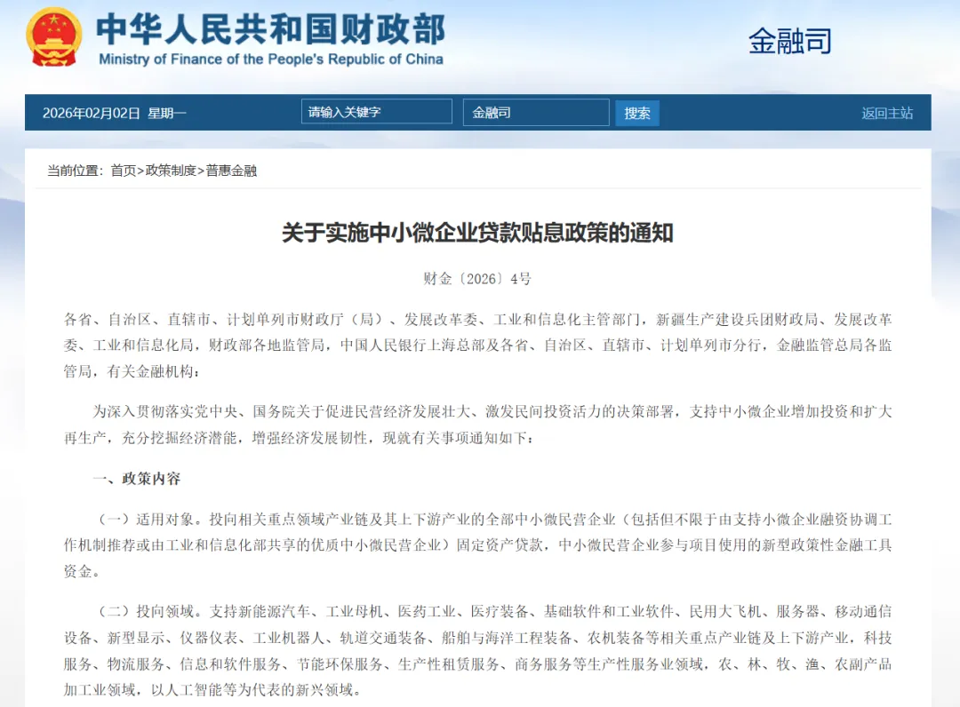 (三)贴息标准。对2026年1月1日起经办银行发放的、符合条件的中小微民营企业固定资产贷款和中小微民营企业参与项目使用的新型政策性金融工具资金,中央财政按照贷款本金给予年化1.5个百分点、期限不超过2年的贴息支持,单户贴息贷款规模上限5000万元。政策实施期限暂定1年,后续可视情延长。同一笔贷款不得重复享受中央财政其他贴息政策。