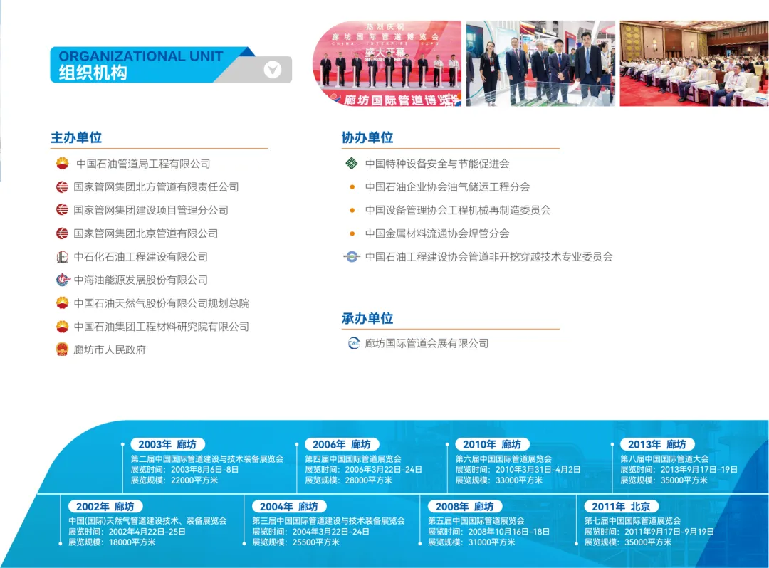第十四届中国(廊坊)国际管道博览会CHINA INTERPIPE EXPO 2026将于2026年4月22-24日在廊坊博览中心举行 廊坊国际管道博览会(INTERPIPE)始创于2002年,现已成为亚太地区举办历史最为悠久的油气储运、油气田地面建设、油气化工等领域,集展览展示、高端峰会技术论坛、采购签约、供需谈判等活动于一身的综合型油气行业专业盛会。大会涵盖了油气工程勘察测绘、设计、采办、施工、投产运行、维护管理、应急抢修等完整油气储运、炼化、油田工程等全产业链。 廊坊国际管道博览会(INTERPIPE)上届展会总面积35000平方米,参展企业350家,参展人数达19000人。此外众多涉及油品销售、地方炼厂、化工公司、市政工程、LNG投资、煤炭企业等领域专业人员也悉数到场参观洽谈采购,同时也见证了中国石油工业高速的发展历程。