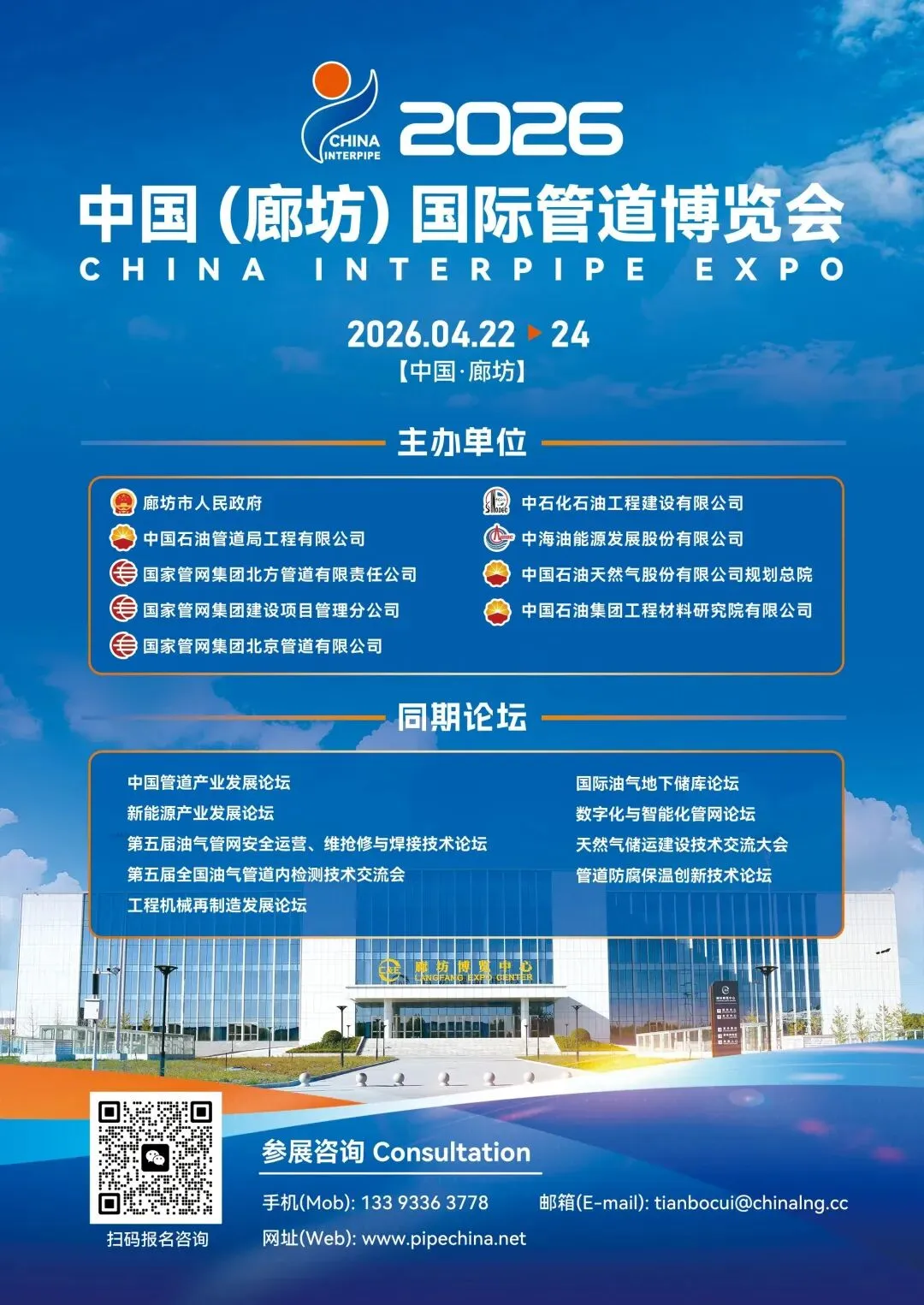 目前,中国(廊坊)国际管道博览会各项筹备工作正在有序推进中,行业同仁可通过官方网站,微信公众号及小程序等方式报名参加。2026年4月22-24日,期待与您相聚廊坊,一起再度起航,携手共同推进行业发展!田女士:13393363778