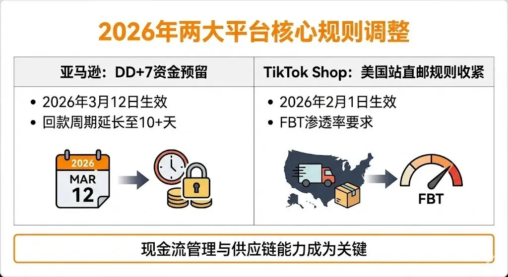 亚马逊将于 2026 年 3 月 12 日起全面实施 "DD+7" 资金预留政策,要求卖家在商品妥投后,货款需额外保留 7 天才能提取。这将进一步拉长卖家的回款周期,加剧现金流压力。