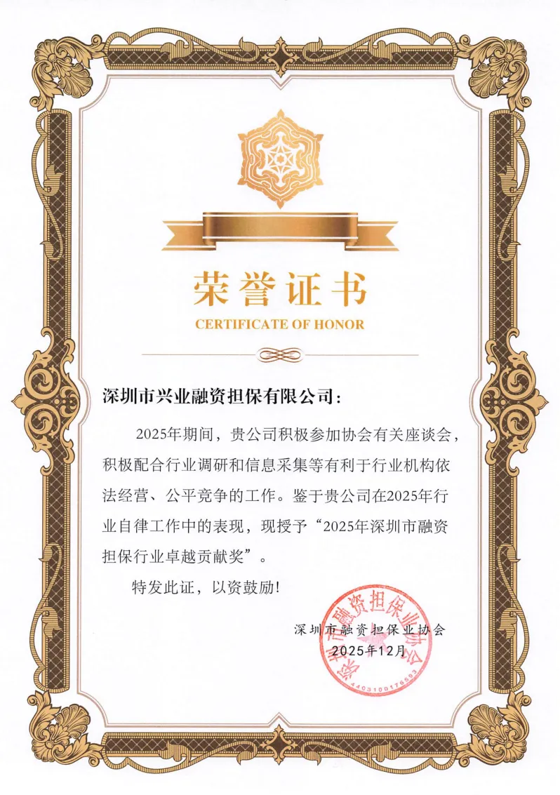 在合规与风控层面,兴业担保公司严格执行监管规定,持续完善治理机制、优化内控体系,将风险管理贯穿业务全流程。凭借规范的运营管理与扎实的风控能力,兴业担保公司在本次全市融资担保公司监管评级中脱颖而出,荣获最高等级的A级监管评级。连续三年荣获行业卓越贡献奖,则进一步彰显了兴业担保公司在推动深圳市融资担保行业健康发展、服务实体经济方面的突出贡献。