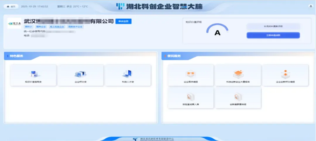企业个人中心展示了企业画像信息,包括企业名称、统一社会信用代码、电话、知识价值评级等。