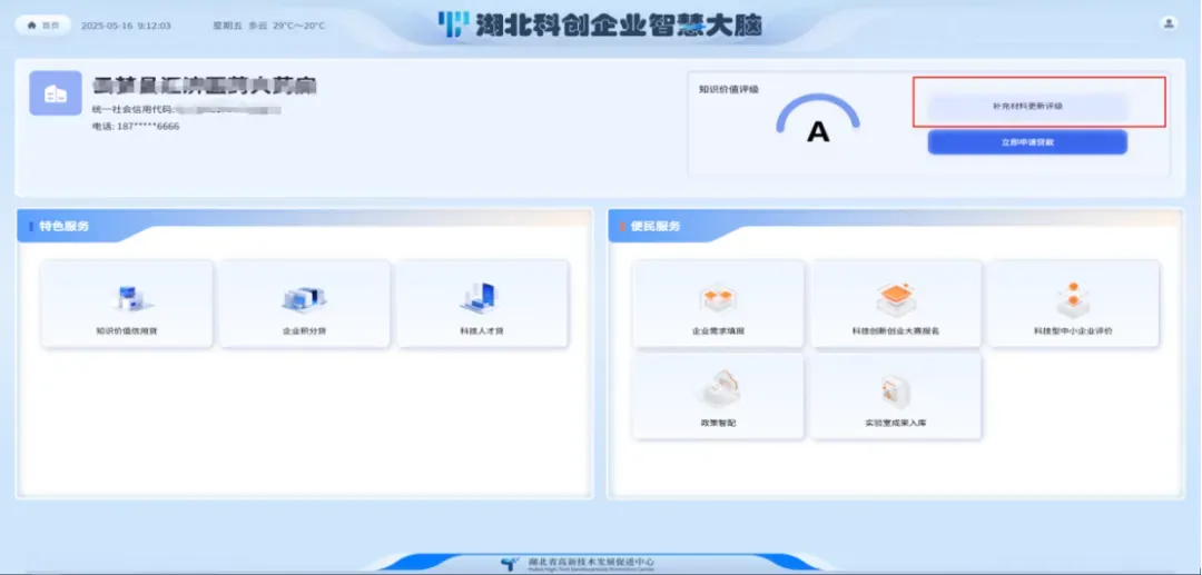在企业中心点击补充材料更新评级按钮,打开申请列表页面,点击发起申请按钮,填写联系人姓名、联系电话、补充材料说明,并上传补充材料,点击提交按钮,等待审核人员进行审核,可查看申请详情。审核通过后获得新评级。