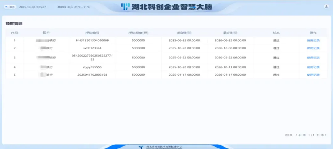 在企业中心-特色服务栏目,点击知识价值信用贷图标,选择额度管理,会打开额度管理列表页面,可查看额度管理信息,包括贷款银行、授信编号、授信额度、授信起始时间、授信截止时间、授信状态等,还可查看额度使用明细。
