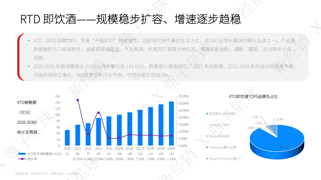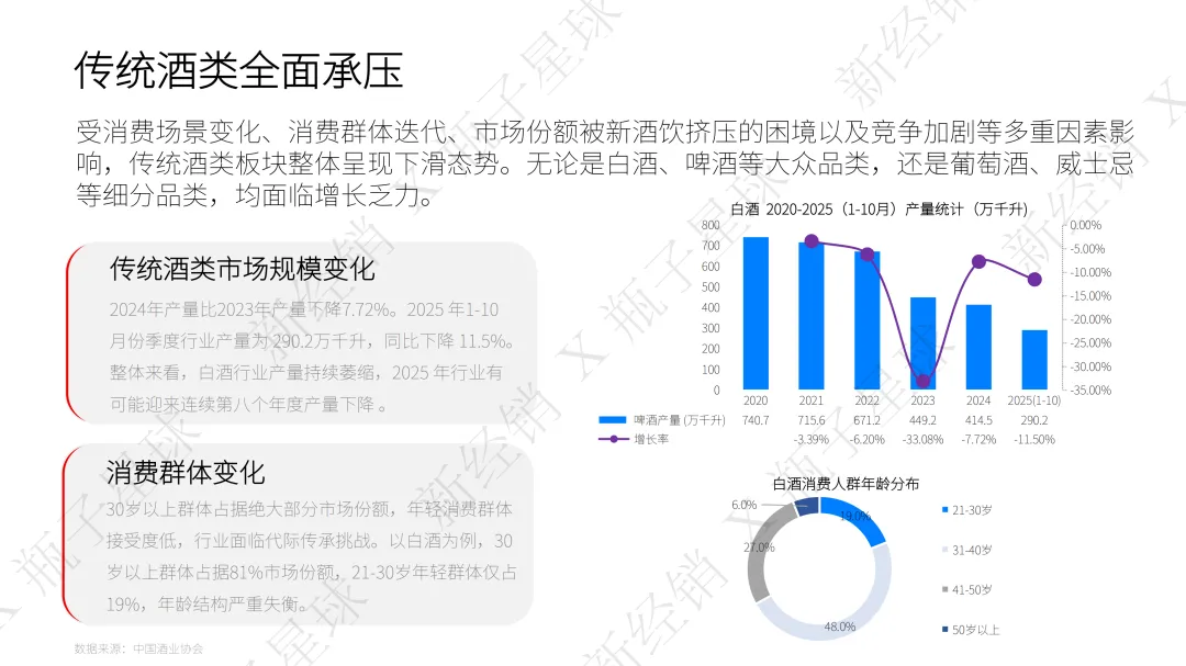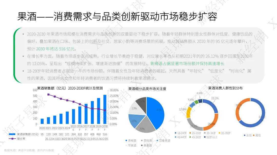 其实关键就在需求、供给和适配三个层面。悦己消费爆发式增长,社交悦己占新酒饮购买目的的79%,年轻人和女性更偏爱低度、健康、场景化的产品,果酒消费中女性占比就高达64.72%。与此同时传统酒类产能下滑、渠道承压,超半数白酒经销商面临库存增加的难题,无法满足新的消费需求。再加上新酒饮品类持续创新,精酿啤酒复合增长率亮眼,搭配即时零售、便利店等渠道革新,完美契合当下年轻人“30分钟微醺”的即时满足需求,这才撑起了高速增长的势头。