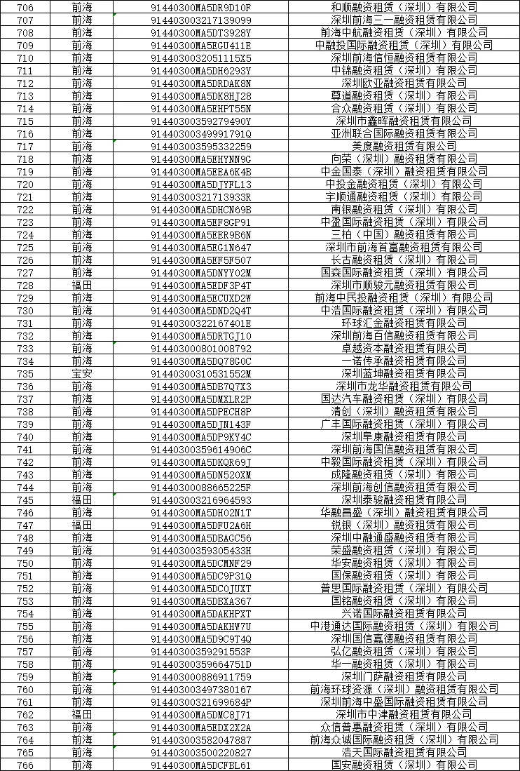 根据《关于进一步加强地方金融组织监管的通知》(金发〔2024〕8号)和《中国银保监会关于印发融资租赁公司监督管理暂行办法的通知》(银保监发〔2020〕22号)相关规定,深圳市地方金融管理局会同前海、各区(新区),认定我市第一批和第二批非正常经营类融资租赁公司名单,分别于2024年5月30日和2025年3月10日对外公告。截至2026年1月底,尚有766家企业未退出行业。