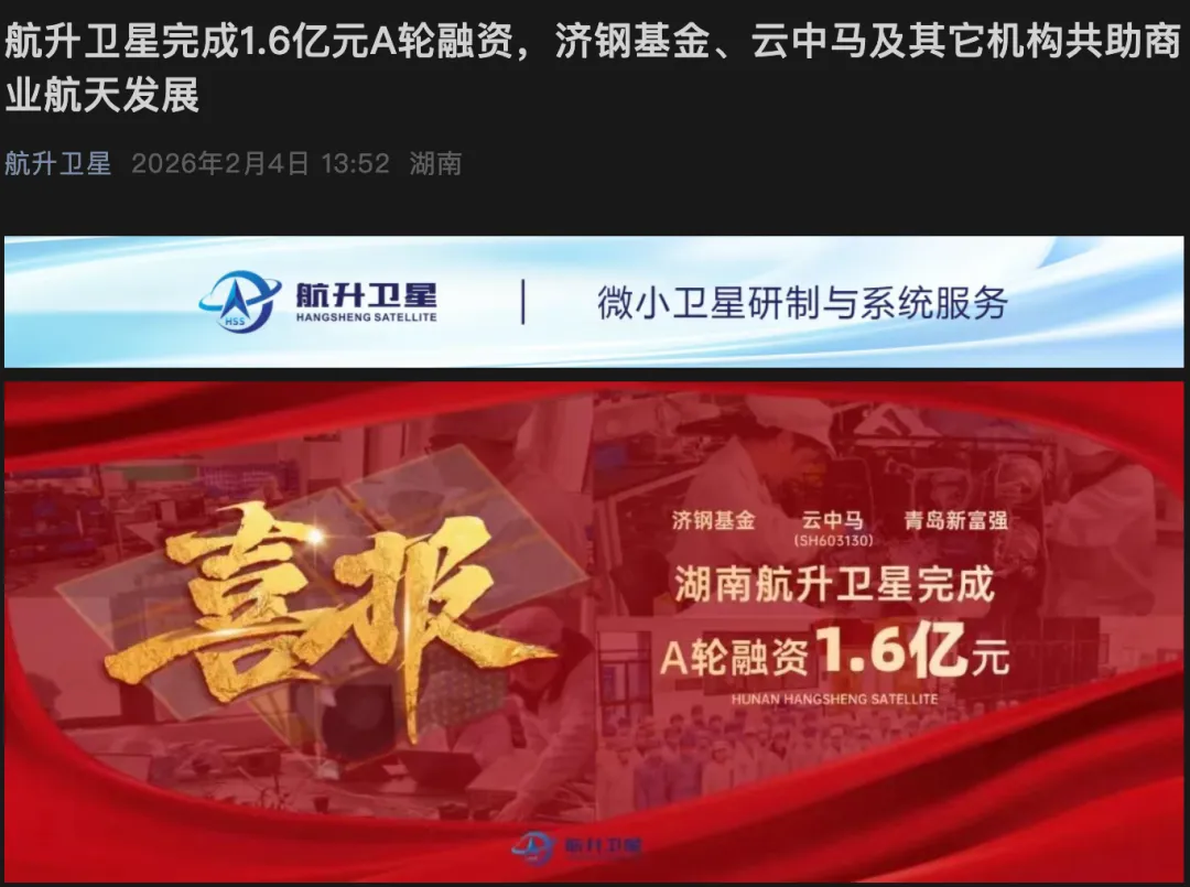 看懂商业航天底层逻辑,把握下一个万亿级市场机会。敬请关注:国内商业卫星制造商“湖南航升卫星科技有限公司”,在今日宣布完成1.6亿元人民币的A轮融资。本轮投资方包括山东省属国企济钢集团旗下基金、A股上市公司云中马及其他知名投资机构,所募资金将主要用于扩充团队、扩建产线及研发高性能卫星产品。从投资方来看,济钢集团旗下基金的参与体现了传统产业资本对商业航天赛道的战略布局;而上市公司云中马的加入,也许更多是基于业务协同或财务投资的考量。航升卫星表示,资金将重点投向核心团队建设、卫星产线扩建、高性能卫星研发及产品型谱完善,旨在全面提升其在卫星部件配套、整星制造乃至星座建设服务方面的综合能力。航升卫星此次获得亿元级融资,是当前商业航天产业链中游——卫星平台与制造环节持续获得资本青睐的又一例证。湖南作为中国航天的重要研发与制造基地之一,拥有良好的产业生态。航升卫星在地域优势情况下,如果能将融资有效转化为产能和产品竞争力,有很大的机会在日益增长的星座供应链中可以占据一席之地。目前,卫星制造领域竞争已日趋激烈,既有“国家队”主力,也有众多灵活的民营公司。获得融资只是拿到了“入场券”,真正的考验在于:是否可以把资金转化为有市场竞争力的核心技术(如:高推重比电推进、高集成度星载电子、先进载荷等)和可靠的批产交付能力。航升卫星能否借力资本,在卫星的“工业化制造”道路上跑出加速度,值得我们持续关注。看懂商业航天底层逻辑,把握下一个万亿级市场机会。敬请关注: