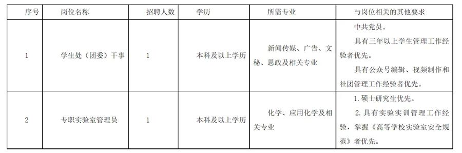 为进一步促进学院建设和发展,依据《劳动法》《劳动合同法》等,现面向社会公开招聘学生处(团委)干事1名、专职实验室管理员1名,现公告如下: