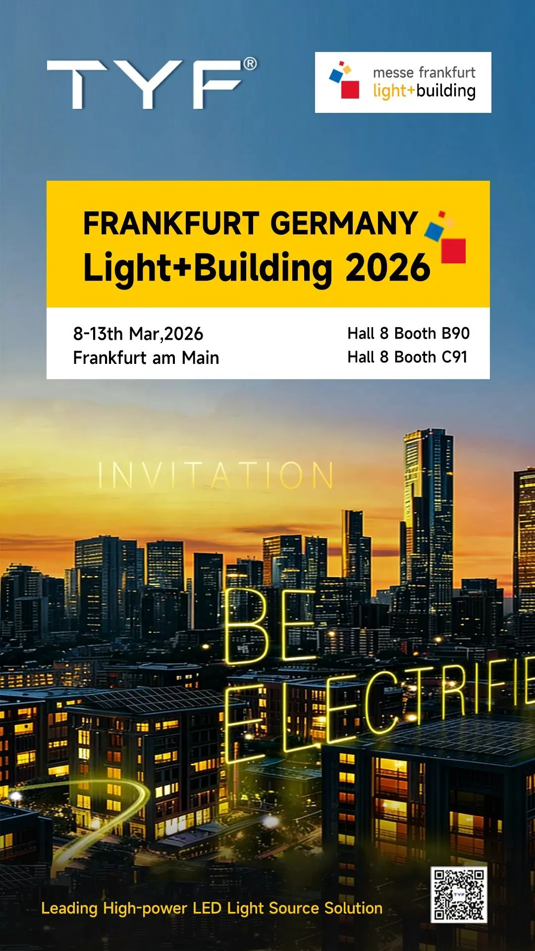 3月8日-13日,2026法兰克福国际照明展(Light+Building)将在德国法兰克福展览中心盛大启幕。这场全球照明与建筑技术领域的顶级盛会,是定义行业趋势的核心风向标,本届更聚焦电气化与数字化融合的前沿发展,引领照明产业新生态。TYF同一方双展位重磅亮相8号馆B90/C91展位,诚邀全球行业大咖莅临交流,共探行业新机遇!From March 8th to 13th, 2026, the leading global trade fair Light + Building will grandly open at the Messe Frankfurt exhibition center in Germany. As the premier event in the global lighting and building technology sector, it serves as the definitive barometer for industry trends. This edition will place a special focus on the frontier integration of electrification and digitalization, guiding the evolution of a new lighting industry ecosystem. TYF will make a significant appearance with dual booths at Hall 8, Stands B90 and C91. We cordially invite industry leaders and experts worldwide to visit and engage in dialogue, jointly exploring new opportunities within the industry!