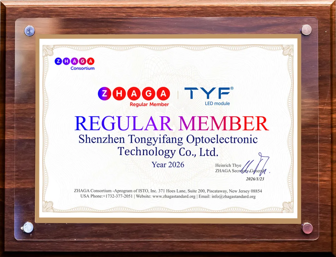 Zhaga联盟作为全球照明接口标准化的核心引领者,始终推动行业互联互通与技术升级。TYF同一方作为Zhaga全权会员,深度参与联盟标准的研讨与迭代,将国际接口规范深度融入产品研发全流程,实现技术与标准的同步接轨,持续提升产品兼容性、互通性及海外市场适配能力。As a global leader in lighting interface standardization, the Zhaga Consortium consistently drives industry-wide interconnectivity and technological advancement. As a Full Member of Zhaga, TYF actively participates in the development and iteration of consortium standards, integrating international interface specifications into every stage of product development. This ensures synchronous alignment with global technologies and standards, continuously enhancing product compatibility, interoperability, and adaptability to international markets.深圳市同一方光电技术有限公司(简称"TYF同一方”),创建于2009年,总部位于深圳,全心专注于科学化LED封装,产品应用于LED通用照明、LED专用照明的国家级专精特新“小巨人”企业。公司一直引领LED封装新技术,提供卓越性能及稳定品质的LED产品和服务,为全球LED照明设计和应用提供更领先、更专业、更全面的光环境解决方案。TYF同一方始终坚持“1+4+N”战略布局:1个核心:大功率LED封装。4大产品平台:COB、SMD、CPD、MOD。N个应用场景:智能照明、健康照明、植物照明、商业照明、户外照明、文娱照明等。坚守LED通用照明市场的深耕与发展,探索LED专用照明细分市场的创新与应用。TYF同一方坚定扛起民族责任,实现高端LED器件国产化,并赢得多国客户的信任转向。