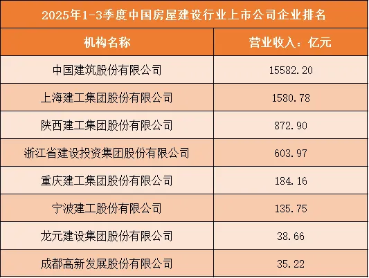一、2025年1-3季度中国房屋建设行业上市公司企业排名分析