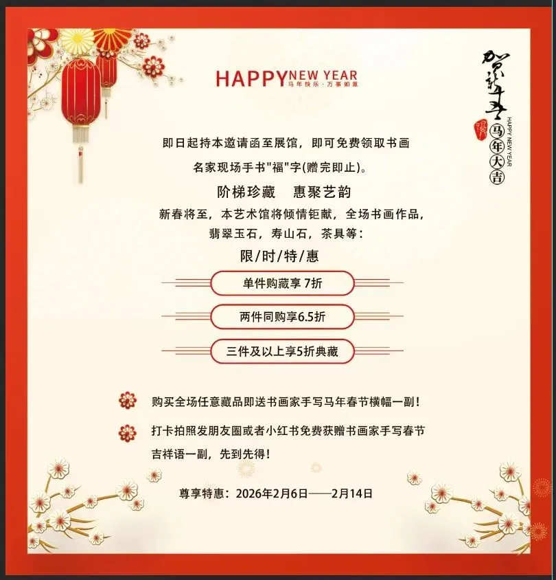 即日起持本邀请函至展馆,即可免费领取书画名家现场手书"福"字(赠完即止)。机会难得,不容错过!!!
