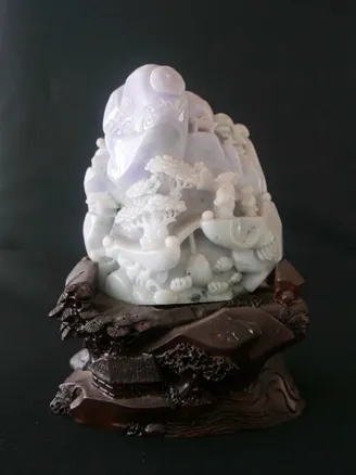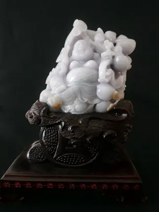 天然冰糯种紫罗兰佛公大摆件,玉质莹润,色泽极佳,雕工精湛。寓意幸福美满,万事顺利之意。
