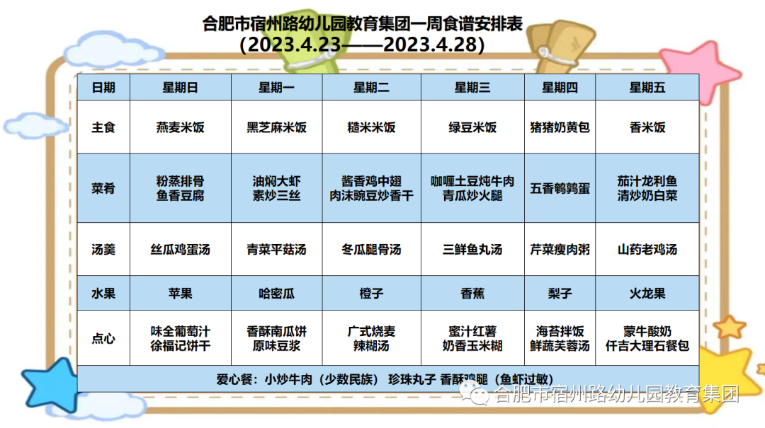 【美好“食”光】合肥市宿州路幼儿园教育集团2023.4.23-4.28幼儿食谱