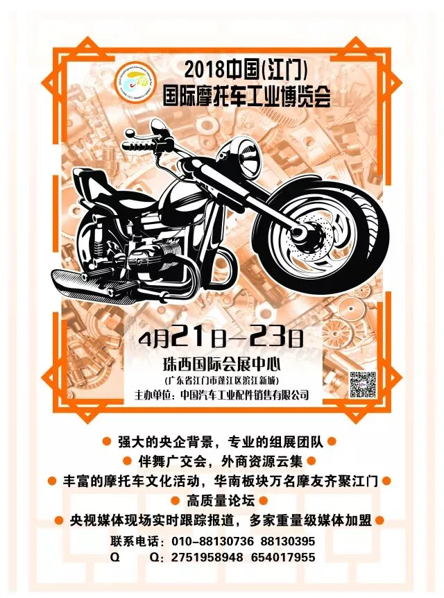 由中国汽车工业配件销售有限公司举办的“2018中国(江门)国际摩托车工业博览会”将于2018年4月21日至23日在珠西国际会展中心召开!
