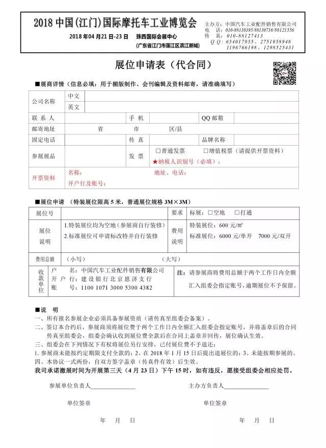 报名申请展位→填写《展位申请表(代合同)》并盖章传真至组委会→付款→展位费到款后主办方盖章回传合同生效→展位申请成功