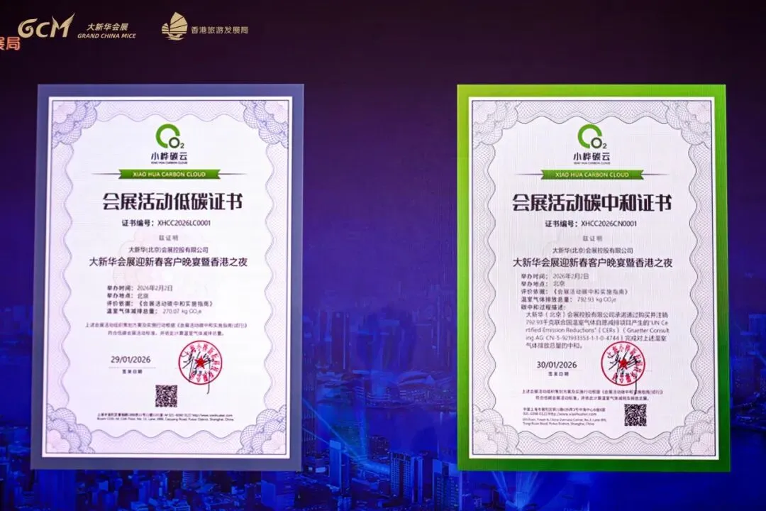 而当晚的宴席本身,便是大新华会展对绿色可持续理念的生动践行。从一纸策划到圆满落地,整场活动严格遵循绿色会议标准,将低碳环保的理念渗透于每一个细节。我们精心考量资源利用,竭力减少碳足迹,活动全程由大新华会展自主研发的“小桦碳云”碳管理小程序进行了精准测算与全链条数字化管理。