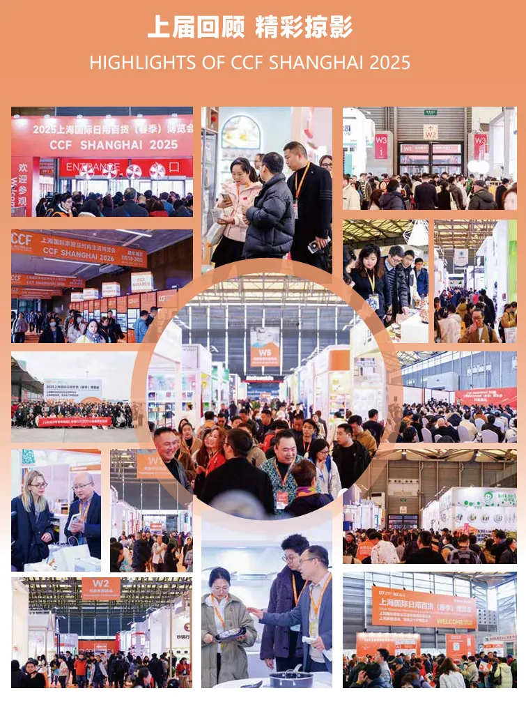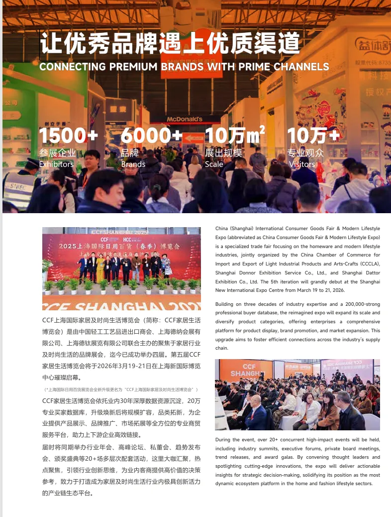 展会全称:CCF 上海国际家居及时尚生活博览会(原 “上海国际日用百货(春季)博览会”)展会主题:让优秀品牌遇上优质渠道升级定位:全新升级・提振消费(外贸优品促内销、创新好物促品牌、AI 智能时尚生活、品类增加渠道覆盖、规模增长扩馆扩容)举办时间:2026 年 3 月 19 日 - 21 日举办地点:上海新国际博览中心主办单位:中国轻工工艺品进出口商会、上海德纳展览有限公司、上海德钛展览有限公司